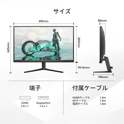 | 主な付属品 | DisplayPortケーブル(1.8m) HDMIケーブル(1.8m) 電源ケーブル(1.8m) クイックスタートガイド 保証書 ケーブル付属リスト ベーススタンド ベース支柱 VESAカバー |