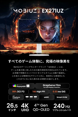 BenQ「EX271UZ」は、同社のハイエンドラインに位置するゲーミングモニターであり、第4世代QD-OLEDパネルを採用した新モデルです。