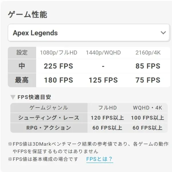 ドスパラ公式サイトでは、本モデルが主要タイトルでどの程度のフレームレートを出せるのか、ゲーム別の目安fpsが公開されています。