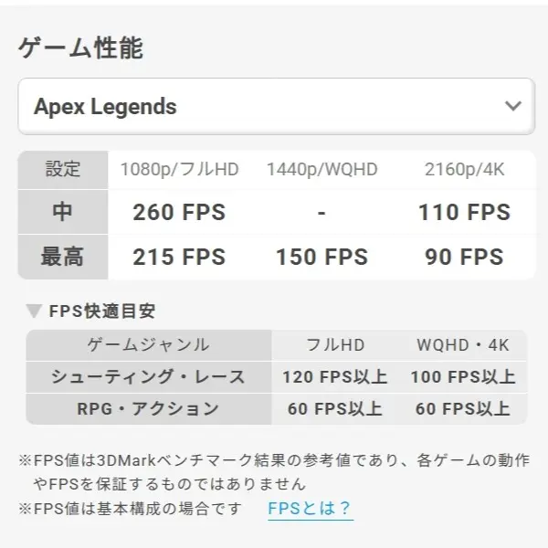 ドスパラ公式サイトでは、本モデルが主要ゲームでどれほどのFPS(目安)を出せるか、タイトル別に詳しく公開されています。