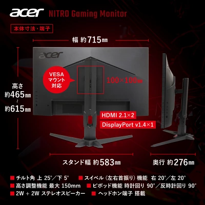 接続端子はHDMI 2.1×2とDisplayPort 1.4×1を装備。最新のゲーム機やハイスペックPCとも相性が良く、4K/160Hzの出力にも対応します。